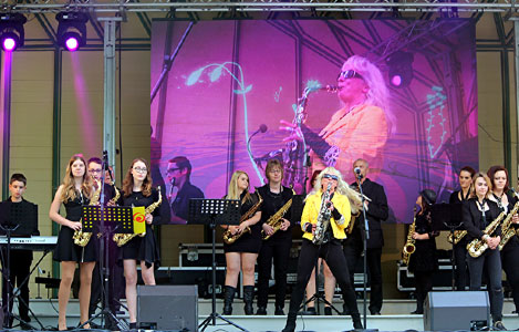 Im großen Stil mit bis zu 30 Kindern und Jugendlichen. Mit ihren goldglänzenden Saxophonen zelebrieren sie einen coolen Sound und sind ein absoluter Hingucker! Zusammen stehen sie mit ihrer attraktiven Chefin als Saxophonistinnen in so mancher Show als Highlight auf einer Bühne.
